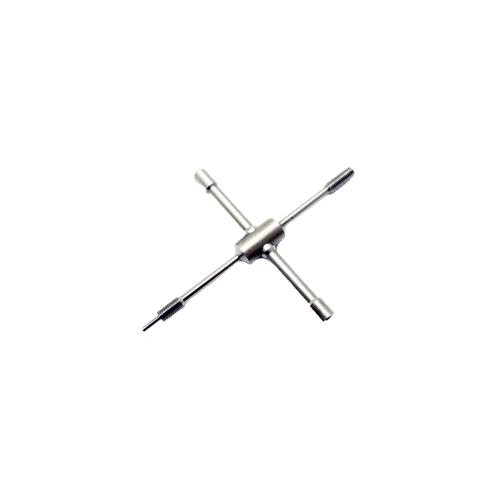 Der Kreuzschlüssel besteht aus hochfestem Edelstahl. Die Schlüssellänge und das Schraubenstück sind so entworfen worden, dass sie einen gleichmäßigen und sicheren Druck auf den Pin ausüben. Dadurch wird dieser sauber aus der Spule gedrückt, ohne sich zu verbiegen oder zu zerkratzen.